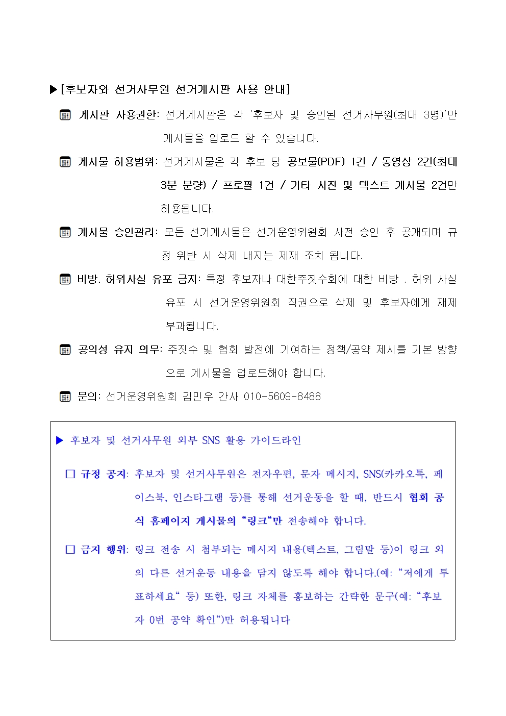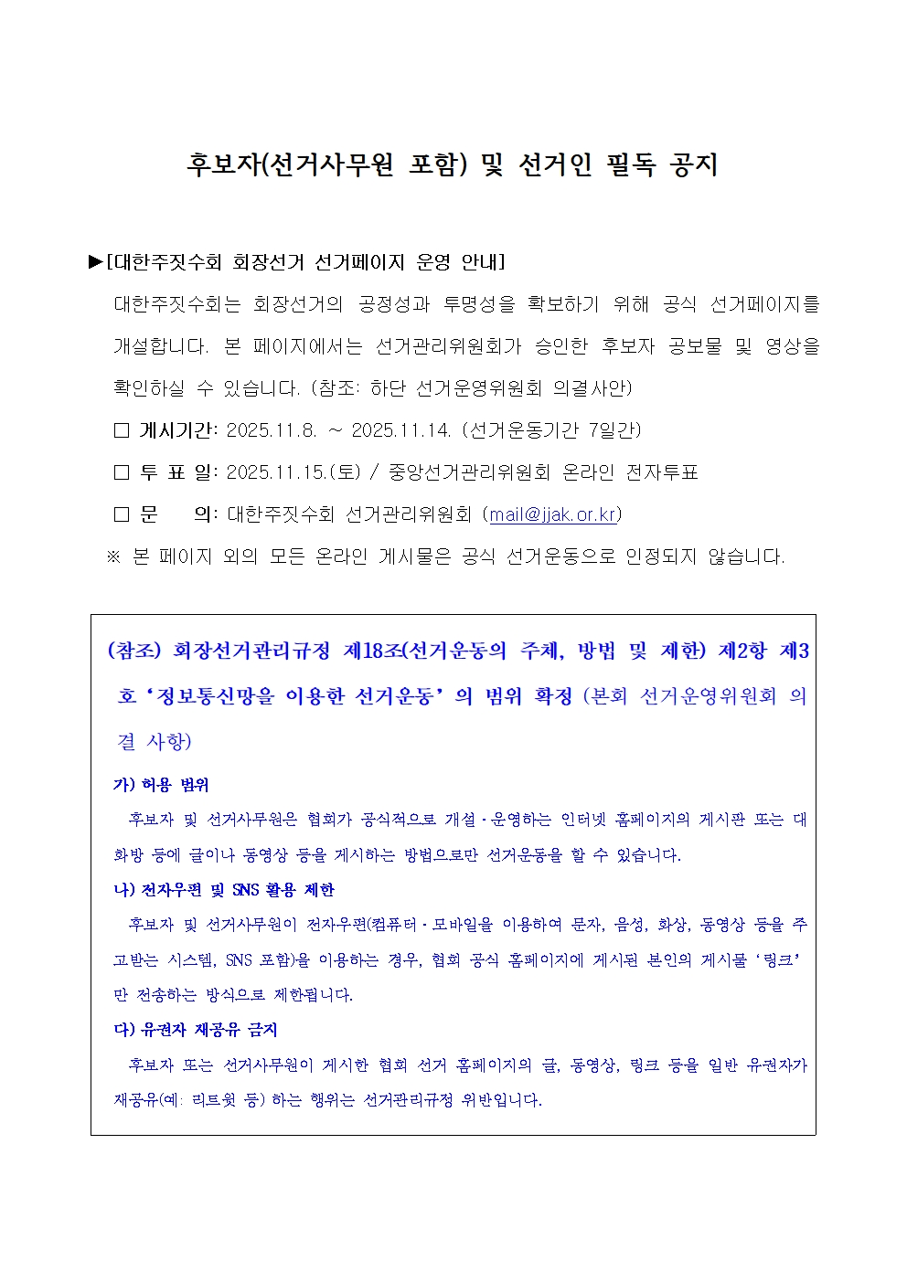 목록 공지 [필독공지] 후보자(선거사무원 포함) 및 선거인 필독 공지 최고관리자 2025-11-06 15:28 (수정: 2025-11-08 02:07) 조회 24 다음글 회원종목단체 회장선거 가이드라인 (선거운동 발췌)